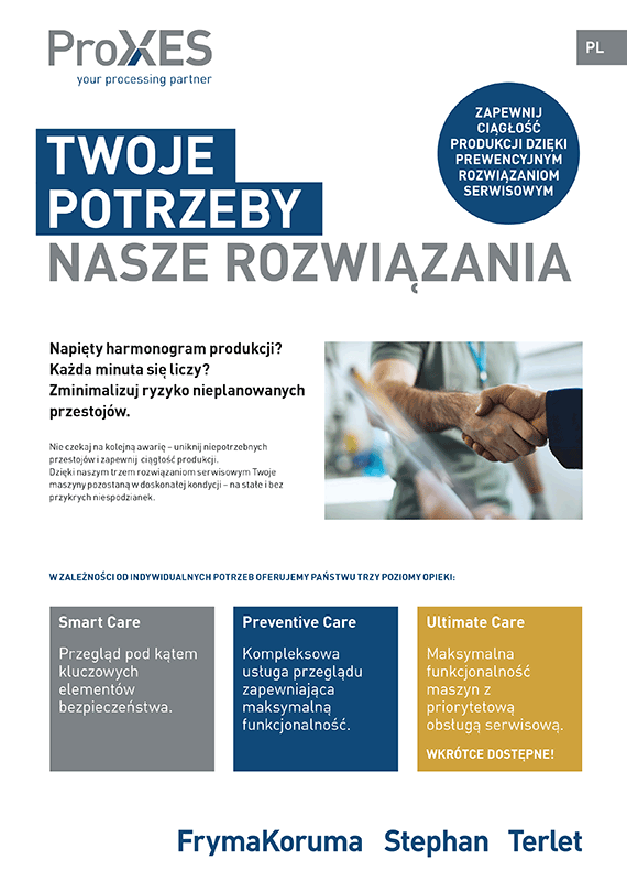 Dzięki zdalnym modułom ProXES (opcjonalnie dostępnym z nowymi maszynami i jako modernizacja) inżynierowie będą mogli pomóc zdalnie, zaglądając do systemu automatyzacji procesu i oprogramowania. Podłączony na stałe (moduł LAN) lub za pośrednictwem SWAT BOX tylko w razie potrzeby (moduł GSM).